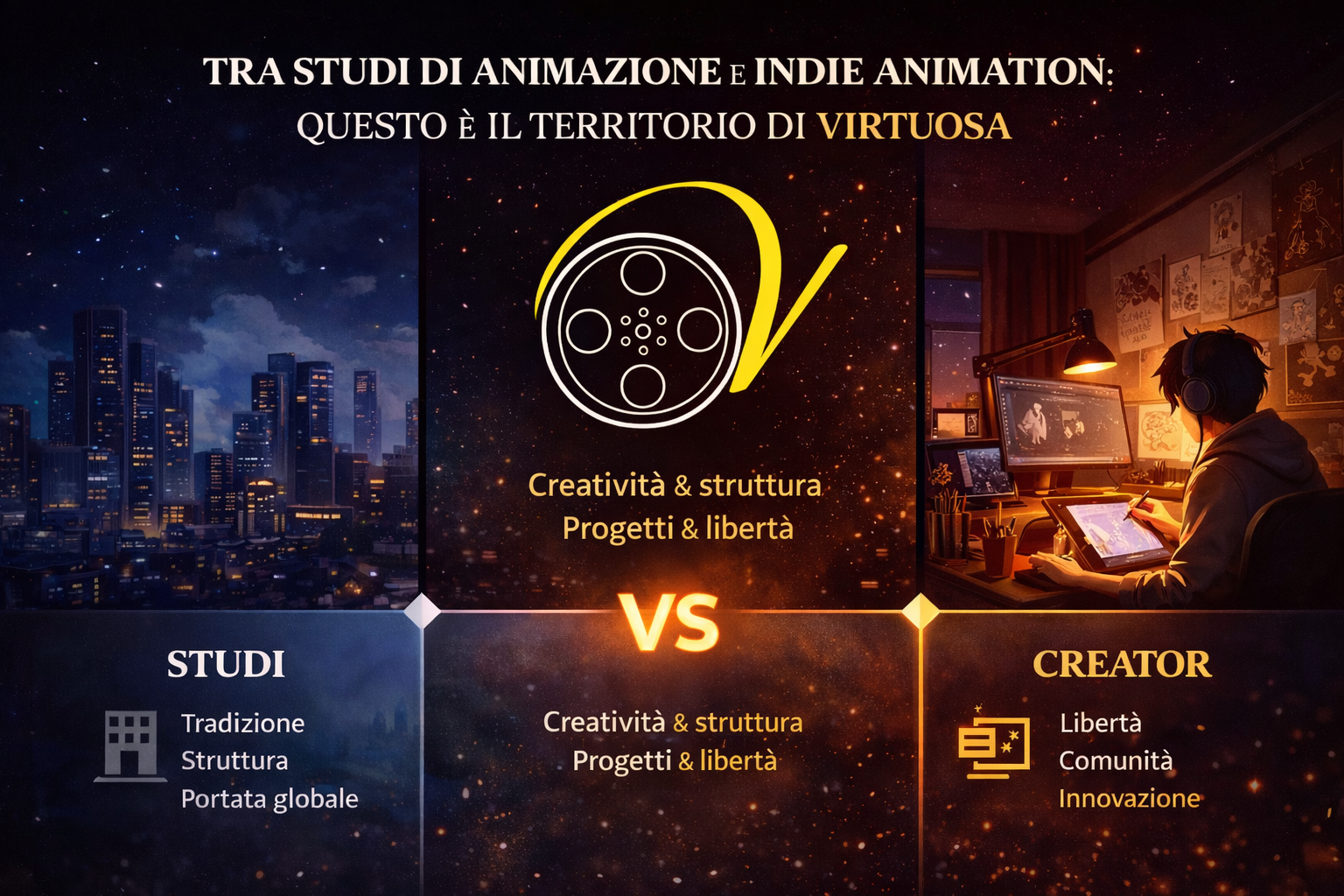 In questo panorama in trasformazione, Virtuosa si colloca in una posizione intermedia. Da un lato, condivide con l’animazione indipendente la libertà creativa, l’attenzione al linguaggio visivo e il desiderio di raccontare storie che non nascono da logiche puramente commerciali, mentre dall’altro, mantiene un approccio strutturato al processo produttivo, cercando un equilibrio tra ricerca artistica e costruzione di progetti solidi.